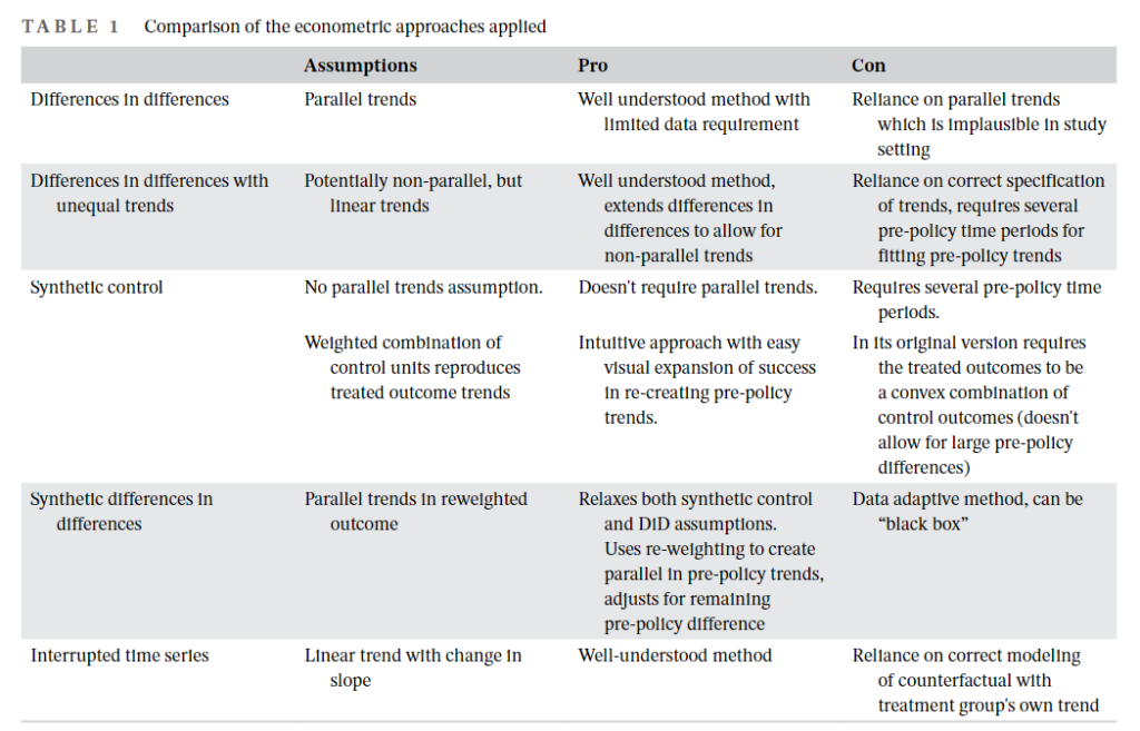 لفحص تأثير تنفيذ نظام DRG على مدة الإقامة في المستشفى (LOS) ، استخدم المؤلفون بيانات من مجموعة بيانات المرضى المقبولين لإحصائيات حلقات المستشفى (HES) في إنجلترا ، وبالنسبة لمجموعة المقارنة الخاصة بهم ، استخدم المؤلفون بيانات مكافئة من اسكتلندا تسمى سجل المراضة الاسكتلندية 01. باستخدام هذه البيانات ، يستخدم المؤلفون مجموعة متنوعة من المواصفات الاقتصادية القياسية بما في ذلك الفروق في الفروق (DiD) والتحكم التركيبي (SC) والسلاسل الزمنية المتقطعة (ITS). نظرًا لأنهم وجدوا أن نهج SC قد فشل في إيجاد ملاءمة جيدة في فترة ما قبل السياسة ، طبق المؤلفون اختلافات تركيبية في الاختلافات التي طورها المؤلفون Arkhangelsky وآخرون ، 2019؛ يمكن أن يتكيف هذا النهج مع التحيز الناتج عن التوافق الضعيف قبل السياسة. يتم سرد إيجابيات وسلبيات كل نهج اقتصادي قياسي في الجدول أدناه: