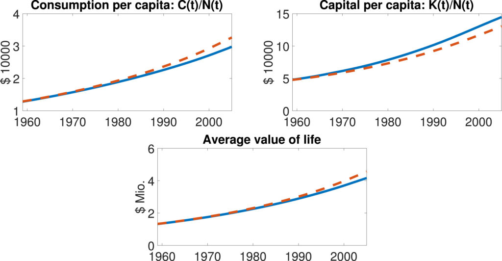 يكمن أحد التفسيرات التي تفسر لماذا تفوق فوائد التقدم الطبي بشكل متزايد على الخسارة من المخاطر الأخلاقية في النمو المستمر للدخل: طالما أن استهلاك الفرد يتزايد بمرور الوقت ، يميل الأفراد إلى تخصيص قيمة متزايدة للحياة (هول وجونز ، 2007و Chen et al.، 2021). تمتد هذه الحجة إلى تقييم الخطر الأخلاقي ، حيث يكون الأفراد على استعداد لتحمل تشويه متزايد من التأمين الصحي مقابل زيادة العمر ، طالما أن هذا يتباطأ فقط ولكن لا يعكس نمو الاستهلاك.