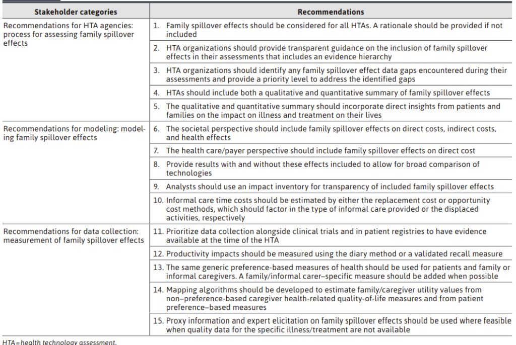 ورقة بقلم كامبل وآخرون (2024) يقدم هذا البحث بعض الإرشادات. فقد وضع المؤلفون سلسلة من التوصيات استناداً إلى مراجعة الأدبيات والمقابلات مع الخبراء وورشة عمل للخبراء من أجل دعم التقييم المتسق والشفاف واستخدام التأثيرات غير المباشرة المعتمدة على الأسرة في تقييمات التكنولوجيا الصحية وتحليلات فعالية التكلفة. وتألفت اللجنة الخبيرة من اثنين من المدافعين عن المرضى، واثنين من خبراء الاقتصاد الصحي، واثنين من الباحثين في النتائج، وخبير واحد في السياسة الصحية، ودافع واحد.