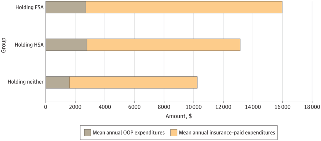… أنفقت الأسر التي لديها حسابات ادخار صحية متوسط 20% أو 2033 دولارًا (95% فاصل ثقة، 789-3276 دولارًا) أكثر على الرعاية الصحية سنويًا مقارنة بالأسر التي لا تمتلك حسابات ادخار صحية، ويرجع ذلك إلى حد كبير إلى زيادة النفقات المدفوعة من قبل شركات التأمين. أنفقت الأسر التي لديها حسابات ادخار صحية متوسط 44% أو 697 دولارًا (95% فاصل ثقة، 521-873 دولارًا) أكثر على النفقات الشخصية وكانت نفقاتها المدفوعة من قبل شركات التأمين أعلى بشكل طفيف من الأسر التي لا تمتلك حسابات ادخار صحية، مما أدى إلى نفقات إجمالية مماثلة لتلك التي يتحملها غير حاملي الحسابات. كانت النفقات الضريبية الإضافية المرتبطة بحسابات الادخار الصحية متوسط 1306 دولارًا (95% فاصل ثقة، 536-2076 دولارًا) سنويًا لكل أسرة.