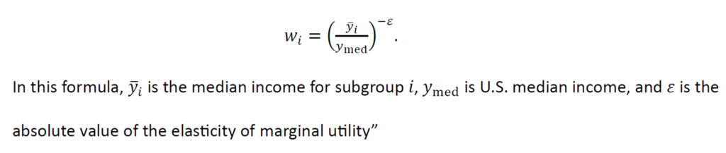 إذًا كيف تؤثر هذه الصيغة على الوزن الذي نعطيه للفوائد والتكلفة بالنسبة للمجموعات المختلفة؟ حسنًا، إذا افترضنا أن متوسط الدخل في الولايات المتحدة هو 75 ألف دولار، فإن قيمة التكاليف والفوائد التي تعود على شخص يبلغ دخله 25 ألف دولار يتم ترجيحها بمقدار 4.7 أضعاف قيمة الشخص المتوسط؛ الشخص الذي يحصل على 400 ألف دولار يكون وزنه أقل بنسبة 90% من الشخص المتوسط.